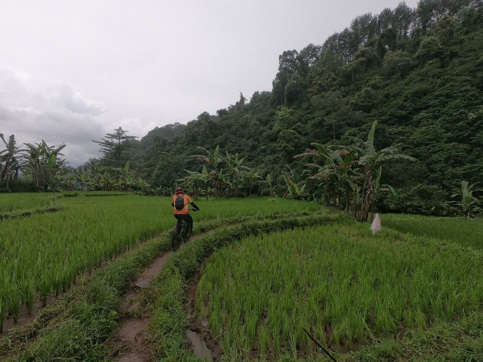 Di sawah ini kebanyakan jalurnya ga bisa di kayuh, karena ada batu, longsor, licin dan lumpur, kudu siap-siap dorong bahkan angkat ya.