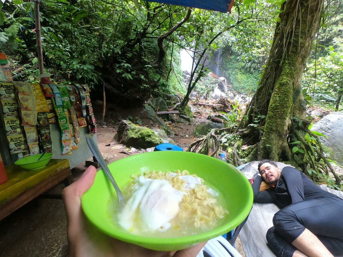 Untuk makanan, ada abang yang jualan mie, teh manis, dan cemilan-cemilan di Curug, harganya cukup bersahabat kok. Kalau yang ga bisa makan mie, silahkan beli makanan di pasar.